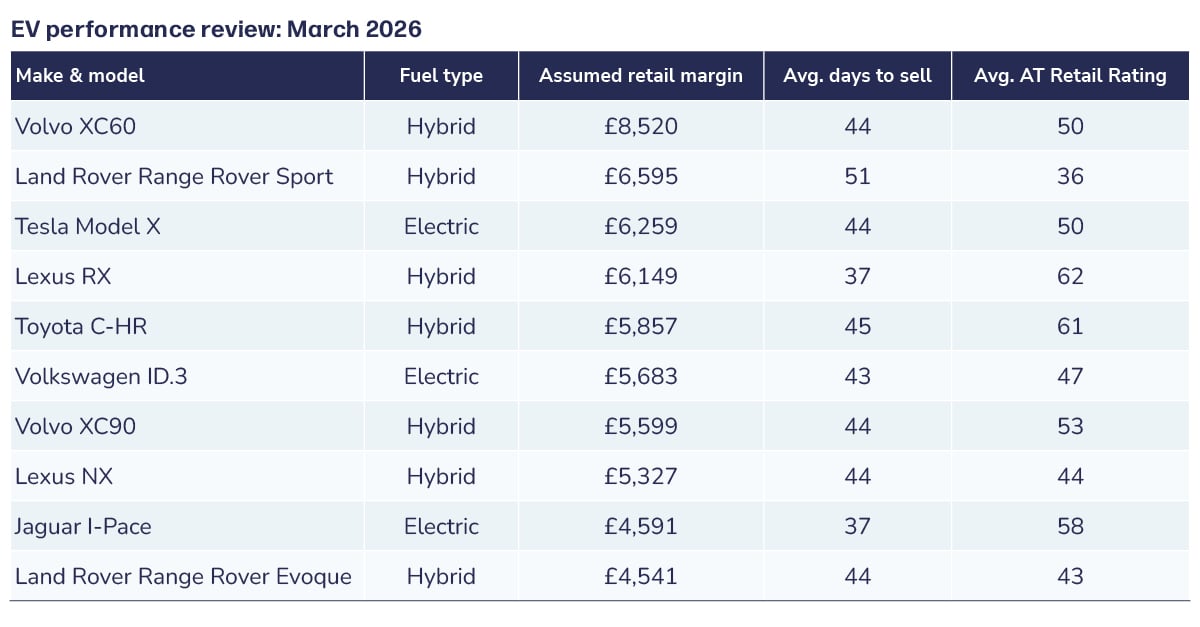 Across Q1, several standout models emerged. The hybrid Hyundai Tucson achieved the second-highest sales volume and secured a top 10 CAP performance position in March. The Tesla Model X maintained strong momentum, ranking in the top 10 for retail margin across the quarter, while the Volvo XC60 consistently led the retail margin charts.
