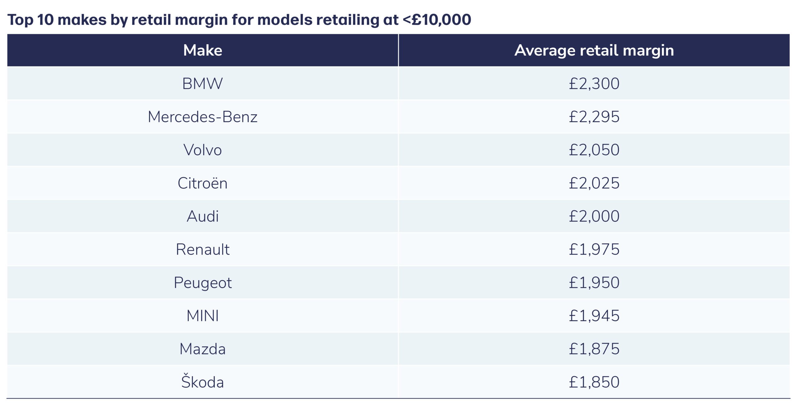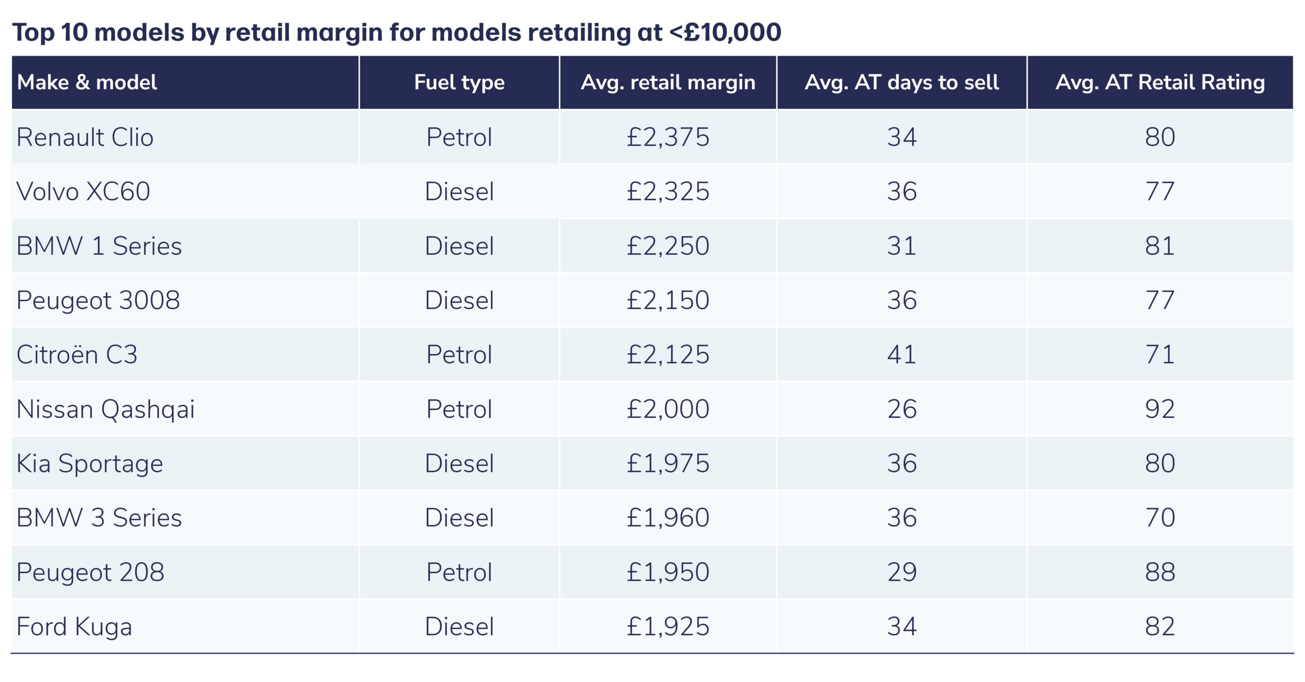 Launched in January 2022, Dealer Auction’s Retail Margin Monitor tracks the potential retail margin that can be achieved on vehicles bought via Dealer Auction’s open network. We track models meeting two key criteria: more than 20 units sold with a retail price of less than £10,000 (we also track any standout models that retail at more than £10,000). We then compare the sold price for each model with the Autotrader market average to reveal the potential margin. For the brand table, we compare models with more than 50 units sold of models retailing at less than £10,000. We crunch the numbers at the start of every new month.